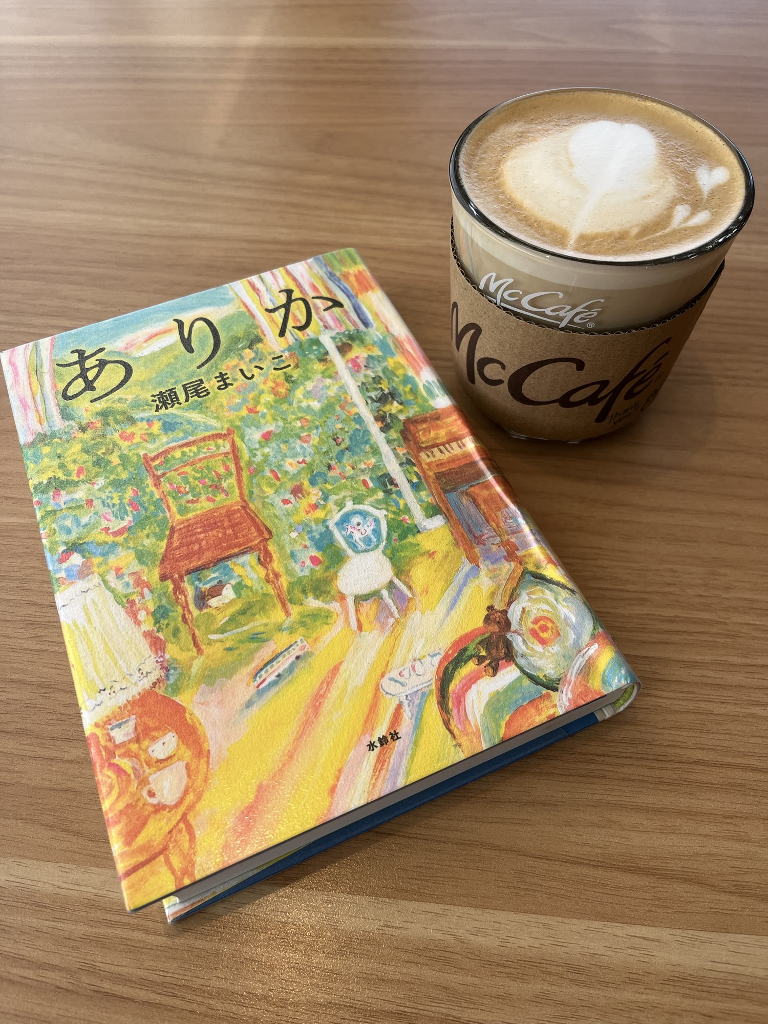 机の色、カフェラテの色、本の色がいい感じ🌻
